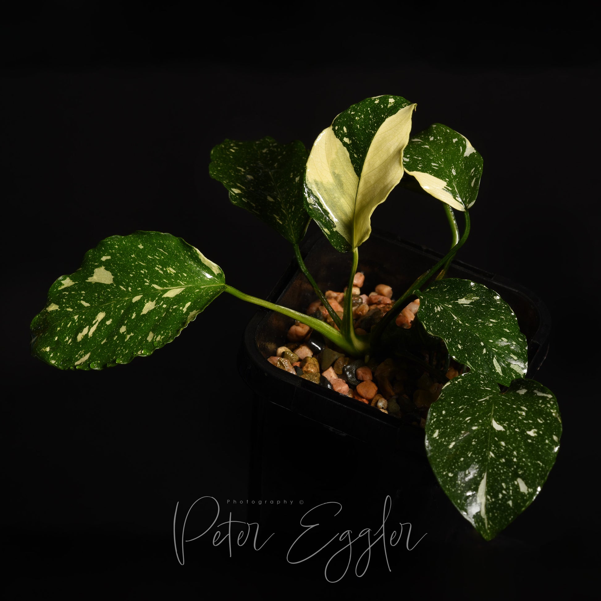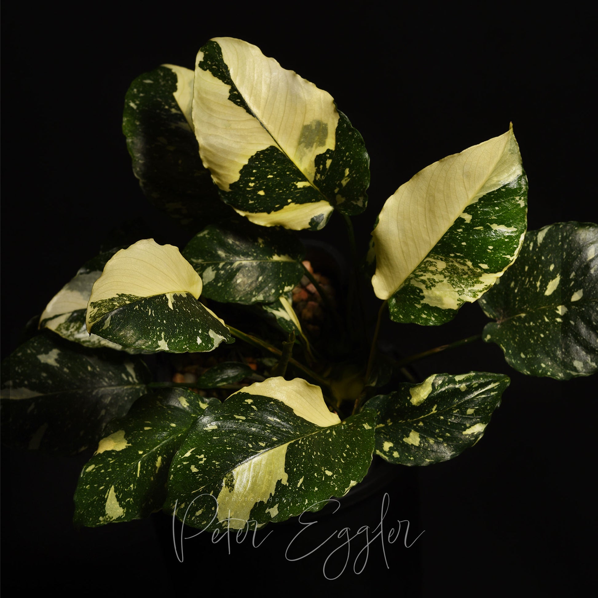 General Information and Cultivation3: A slow growing plant in both emerse and submerse conditions, requiring greater care than most Anubias to look its best. Spectacular patterns of variegation reward the grower who maintains optimum conditions, making Anubias ‘Panda’ a showstopping centrepiece plant for aquarium, terrarium and paludarium. Provide submerse plants with good lighting and CO2 injection. Maintaining unblemished variegation in emerse plants requires more subdued light levels (not too high to burn variegated leaf tissue) and high humidity with daily misting. Attach to wood and rocks, or plant directly into the substrate. Do not bury the rhizome or it may rot. In emerse culture, leaf blades grow to about 90mm×60mm and plants can attain a height of 150mm. Submerse plants produce leaves that are smaller.