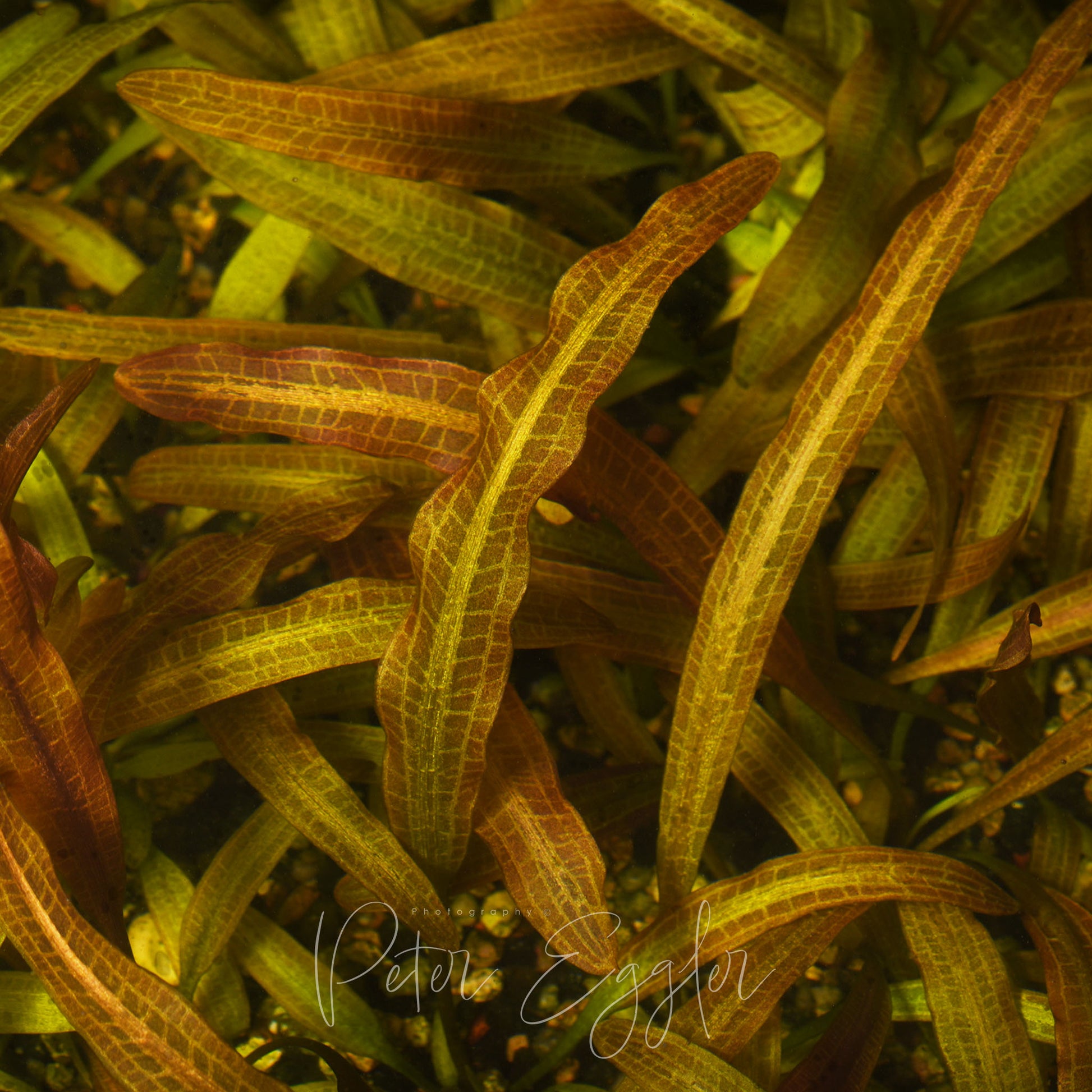 Image 2: Leaf detail of Aponogeton tofus mother plant showing dark brown leaf colouration when grown submerse under high light conditions.