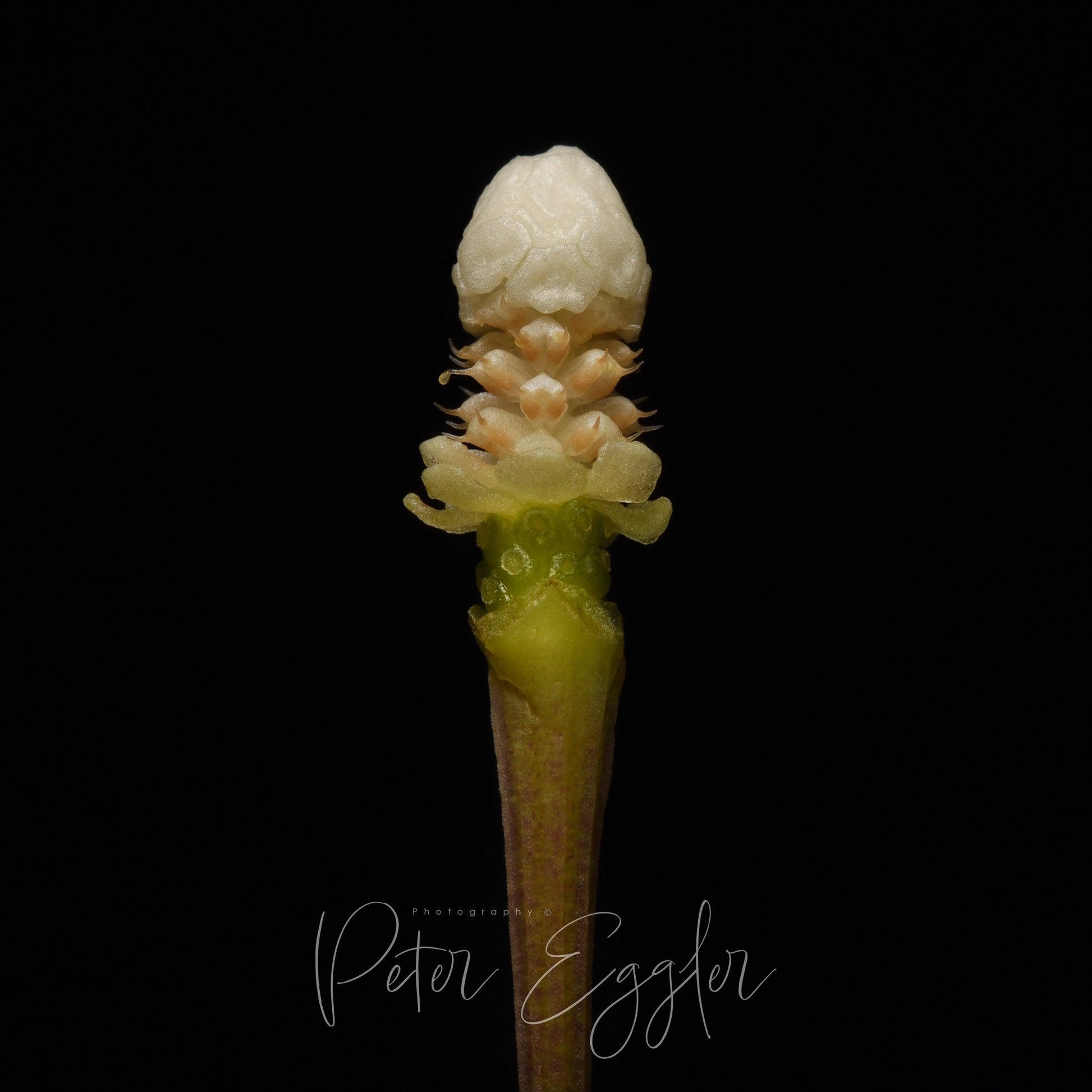 Image 2: Detailed view of the inflorescence of Bucephalandra sordidula (TQ-01037). The spathe has been artificially removed to reveal the entire spadix.