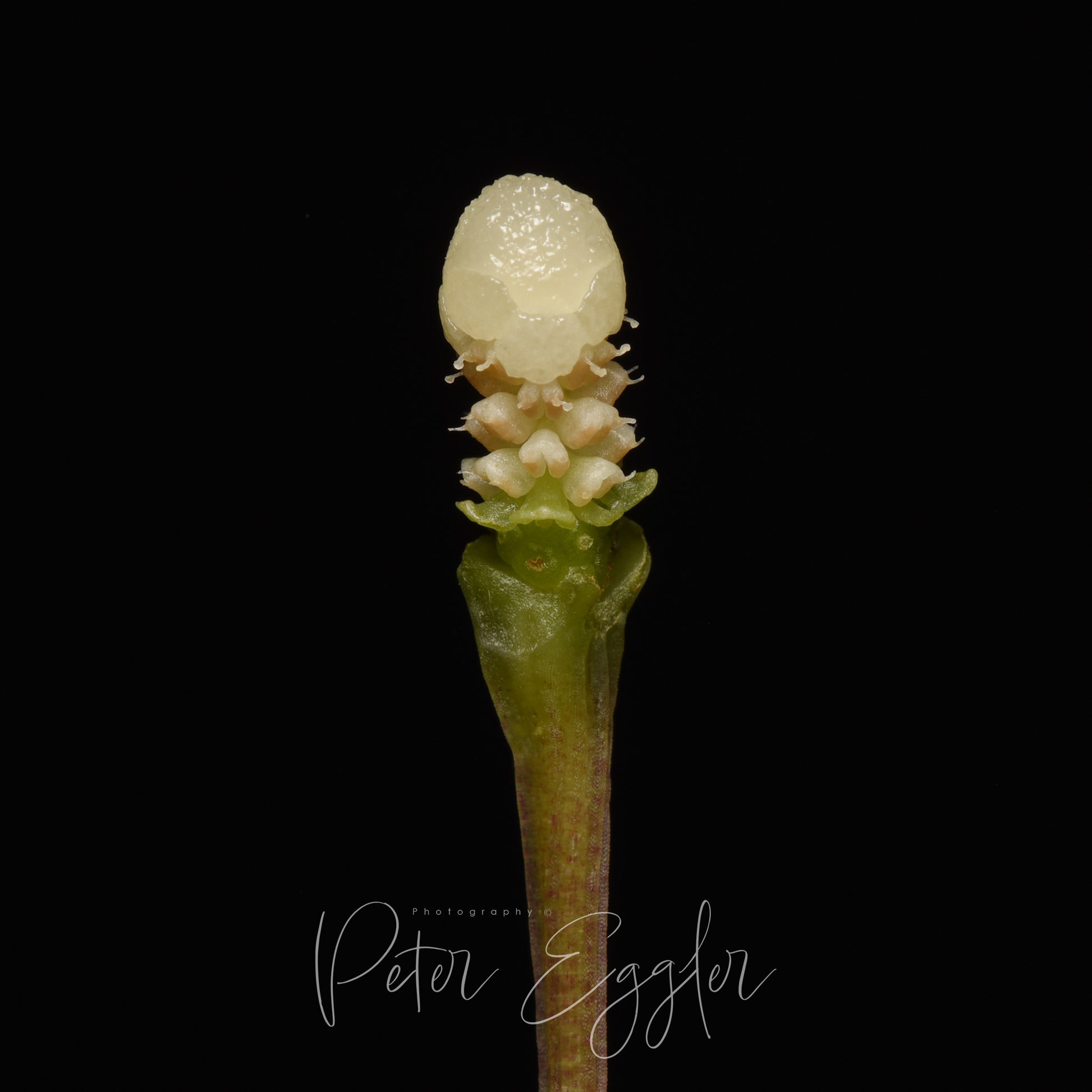 Image 2: Detailed view of the inflorescence of Bucephalandra sp. (TQ-01036). The spathe has been artificially removed to reveal the entire spadix.