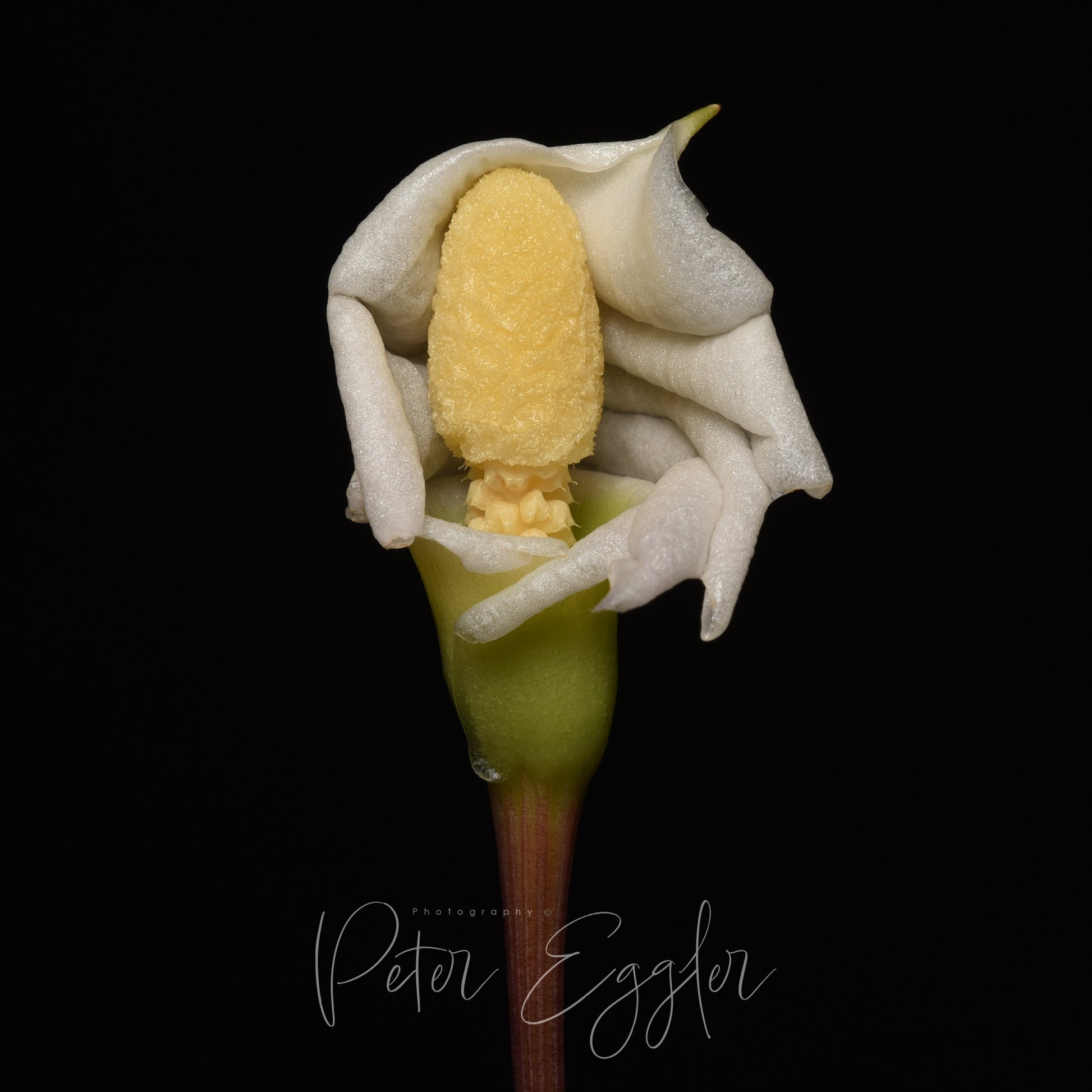 Image 2: The same inflorescence of Bucephalandra sp. (TQ-01048) six days later at onset of staminate anthesis. The spathe has opened, revealing the appendix and staminate zone of the spadix.