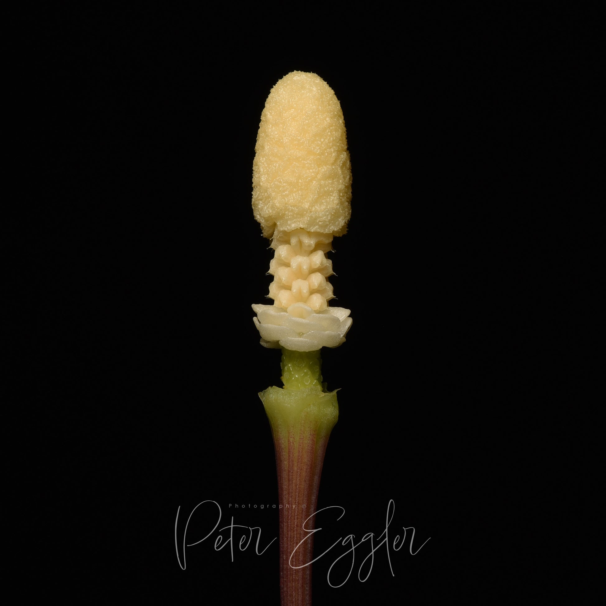 Image 4: Same inflorescence as above with spathe artificially removed to reveal the entire spadix. Visible (from top to bottom) are appendix, staminate (male) flower zone showing thecae, the shield-shaped interstice staminodes, and the pistillate (female) flower zone.