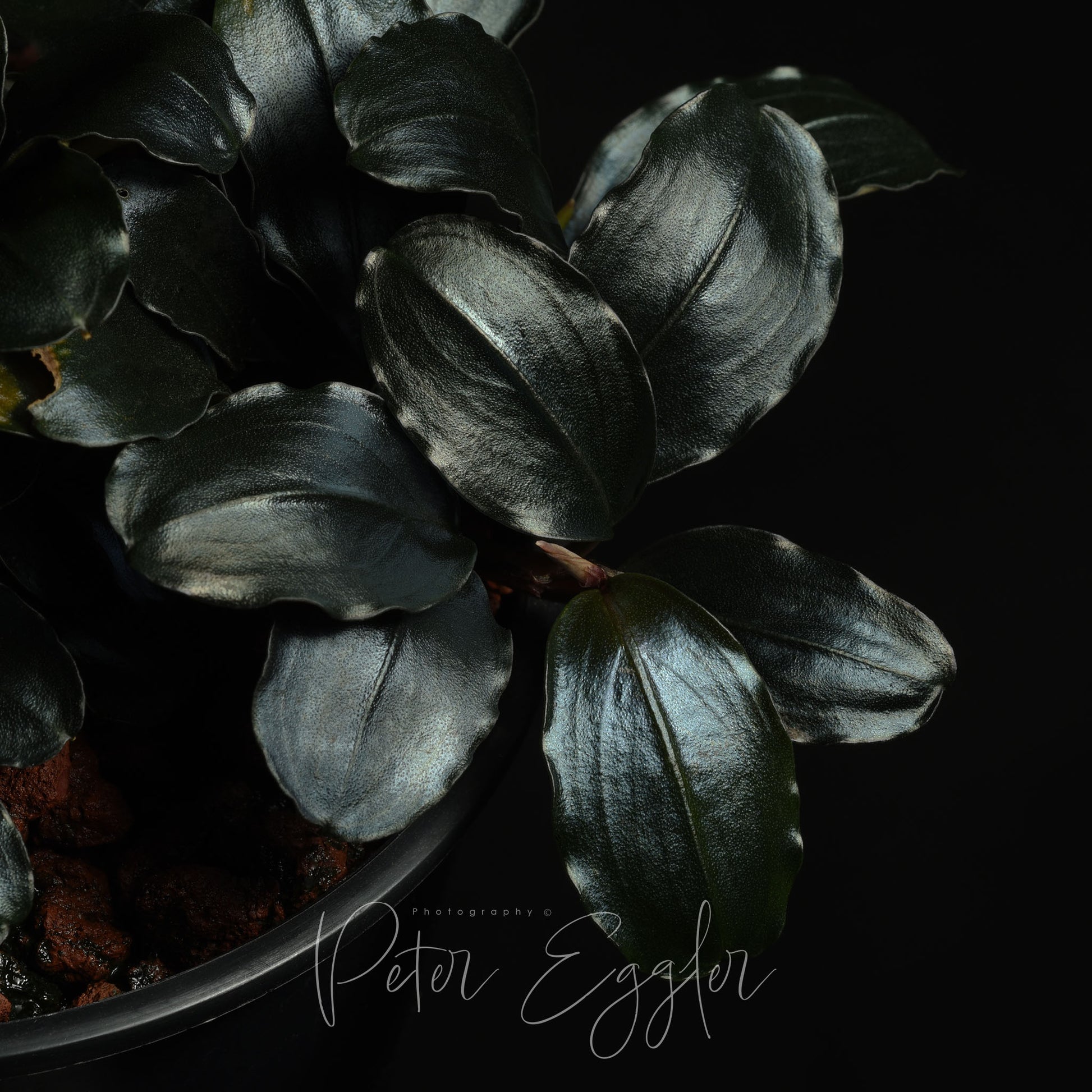 General Information and Cultivation3: A slow growing creeping buce with blue-black, metallic-sheen foliage, relatively easy to cultivate in terrarium conditions if its requirements are met. A moderate amount of ventilation is necessary, and daily misting beneficial. As for all plants in the genus, emerse Bucephalandra sp. (TQ-01063) prefer low-light levels, otherwise bleaching of the leaves may occur. Attach to wood and rocks, or plant directly into the substrate. Do not bury the rhizome or it may rot. In terrarium culture, leaf blades grow to about 45mm×26mm, and plants can reach 60mm in height. Submerse plants are likely to produce leaves that are smaller.