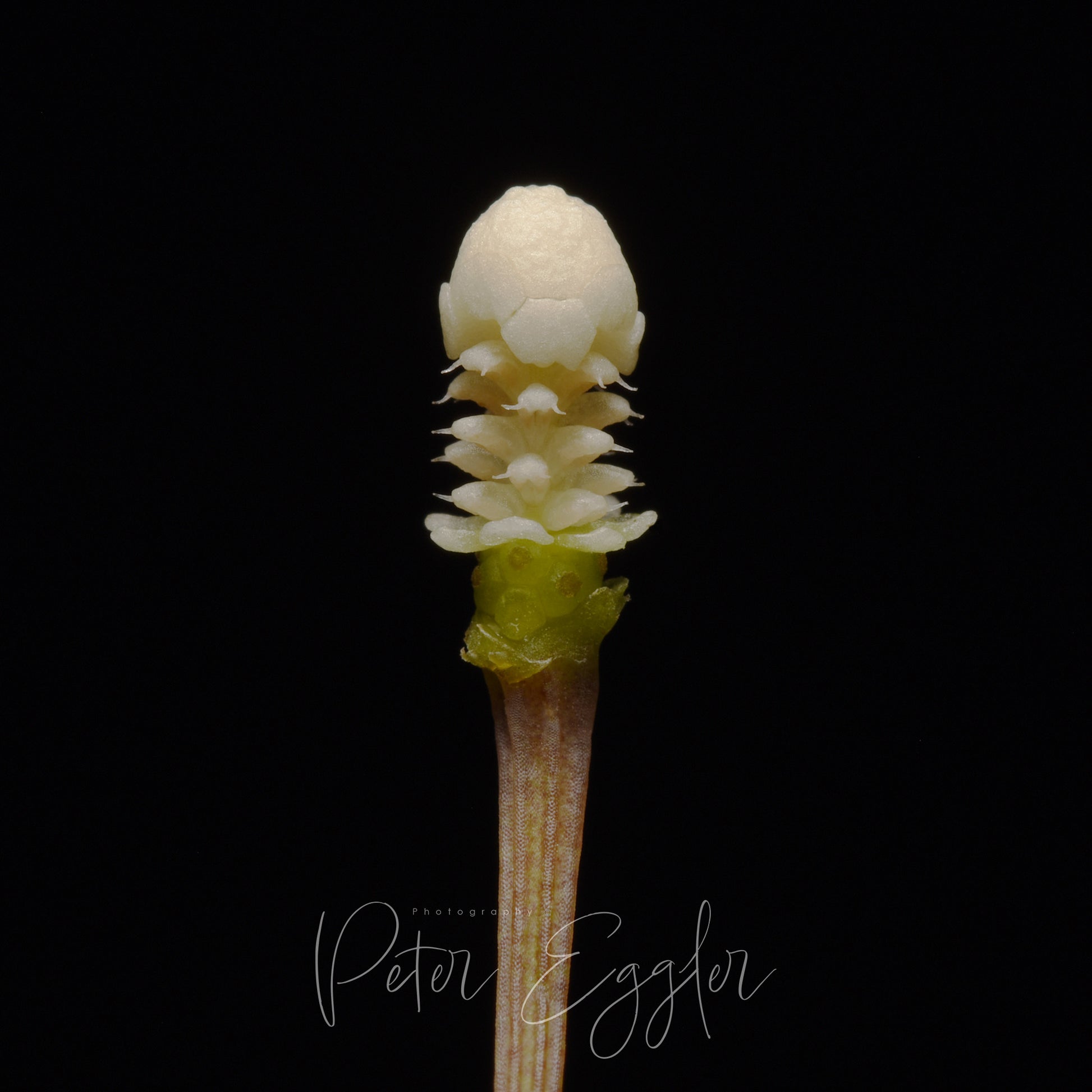 Image 2: Detailed view of the inflorescence of Bucephalandra sp. (TQ-01064). The spathe has been artificially removed to reveal the entire spadix.