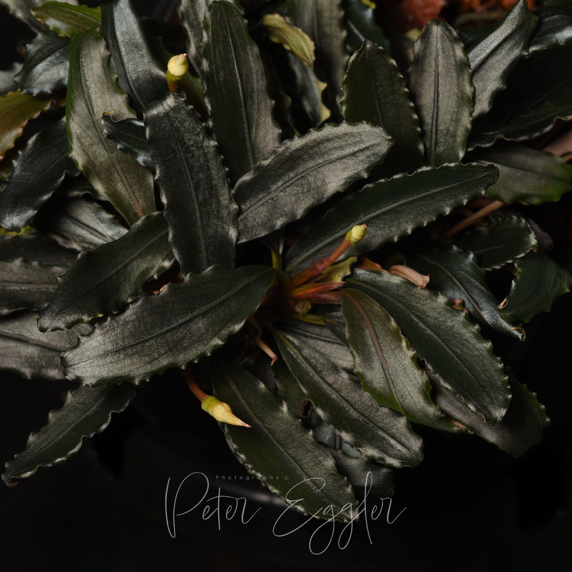 General Information and Cultivation3: A slow growing, medium-size upright buce with dark-green coloured foliage, relatively easy to cultivate in terrarium conditions if its requirements are met. A moderate amount of ventilation is necessary, and daily misting beneficial. As for all plants in the genus, emerse Bucephalandra sp. (TQ-01065) prefer low-light levels, otherwise bleaching of the leaves may occur. Attach to wood and rocks, or plant directly into the substrate. Do not bury the rhizome or it may rot. In terrarium culture, leaf blades grow to about 55mm×15mm, and plant clumps can reach 70mm in height.