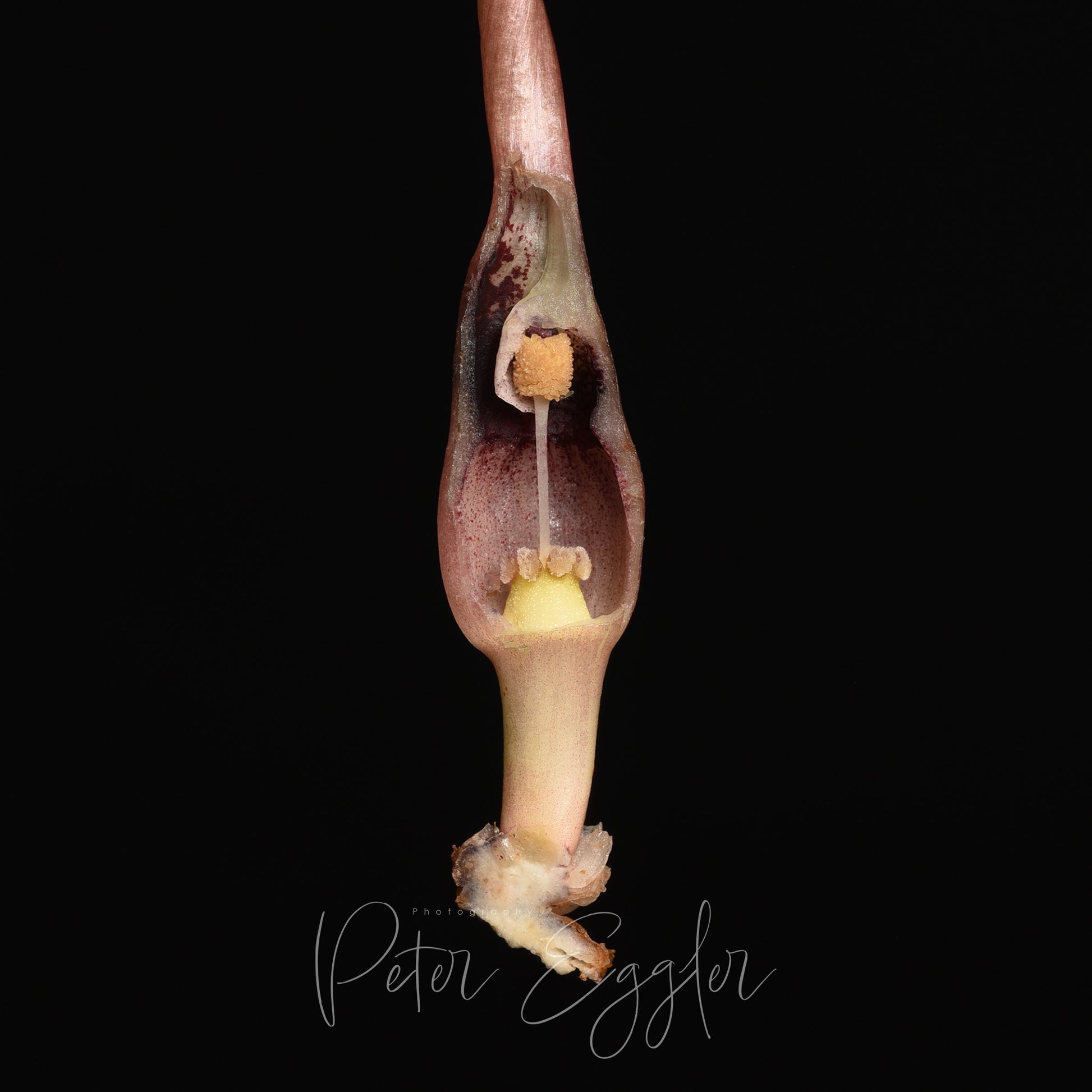 Image 4: The kettle of the spathe of Cryptocoryne crispatula var. albida “brown” (opened to show internal structures).
