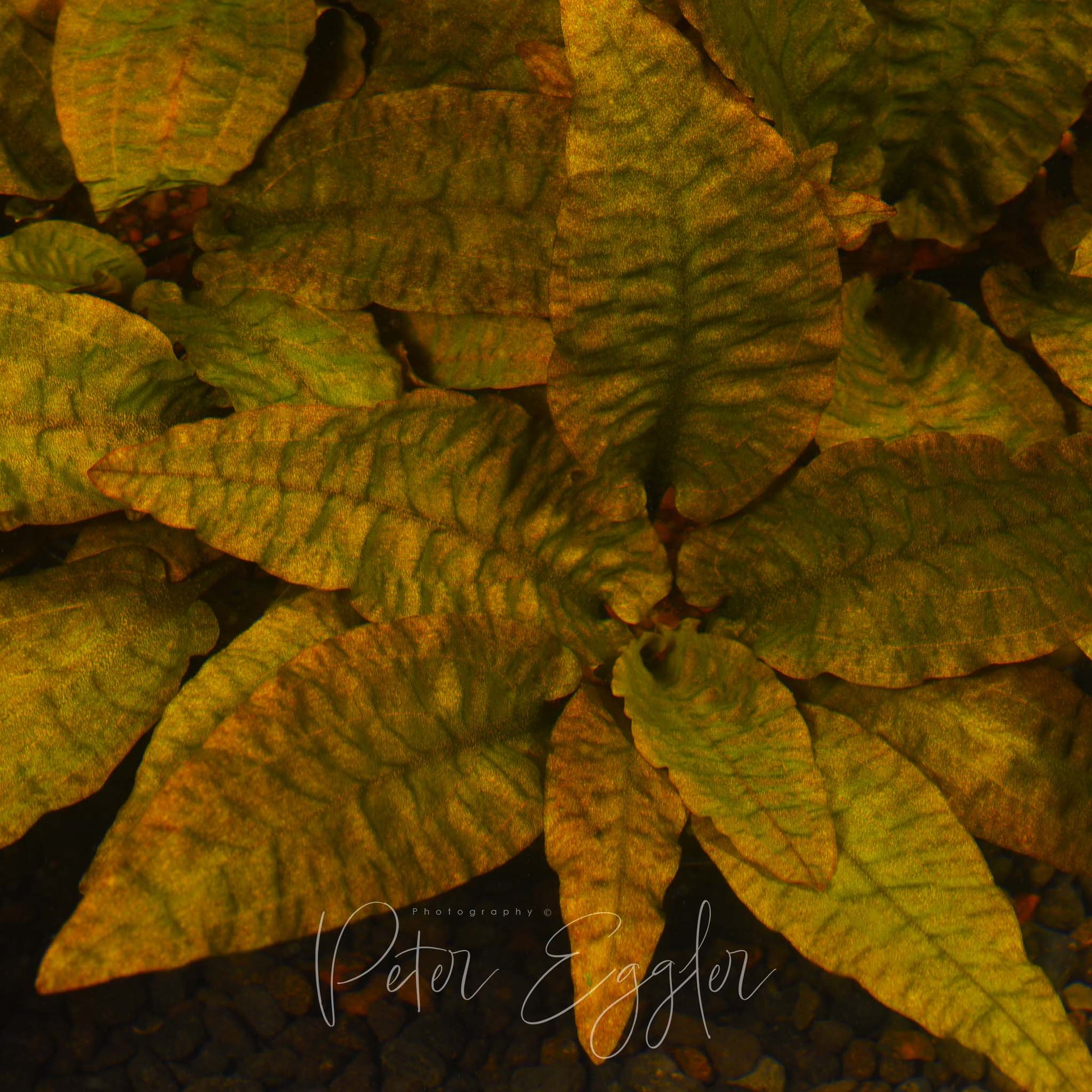 Image 1: Emerse grown Cryptocoryne wendtii ‘Tropica’ showing the darkly coloured bullate leaves that develop when grown under high light conditions. This plant was cultured in a greenhouse.