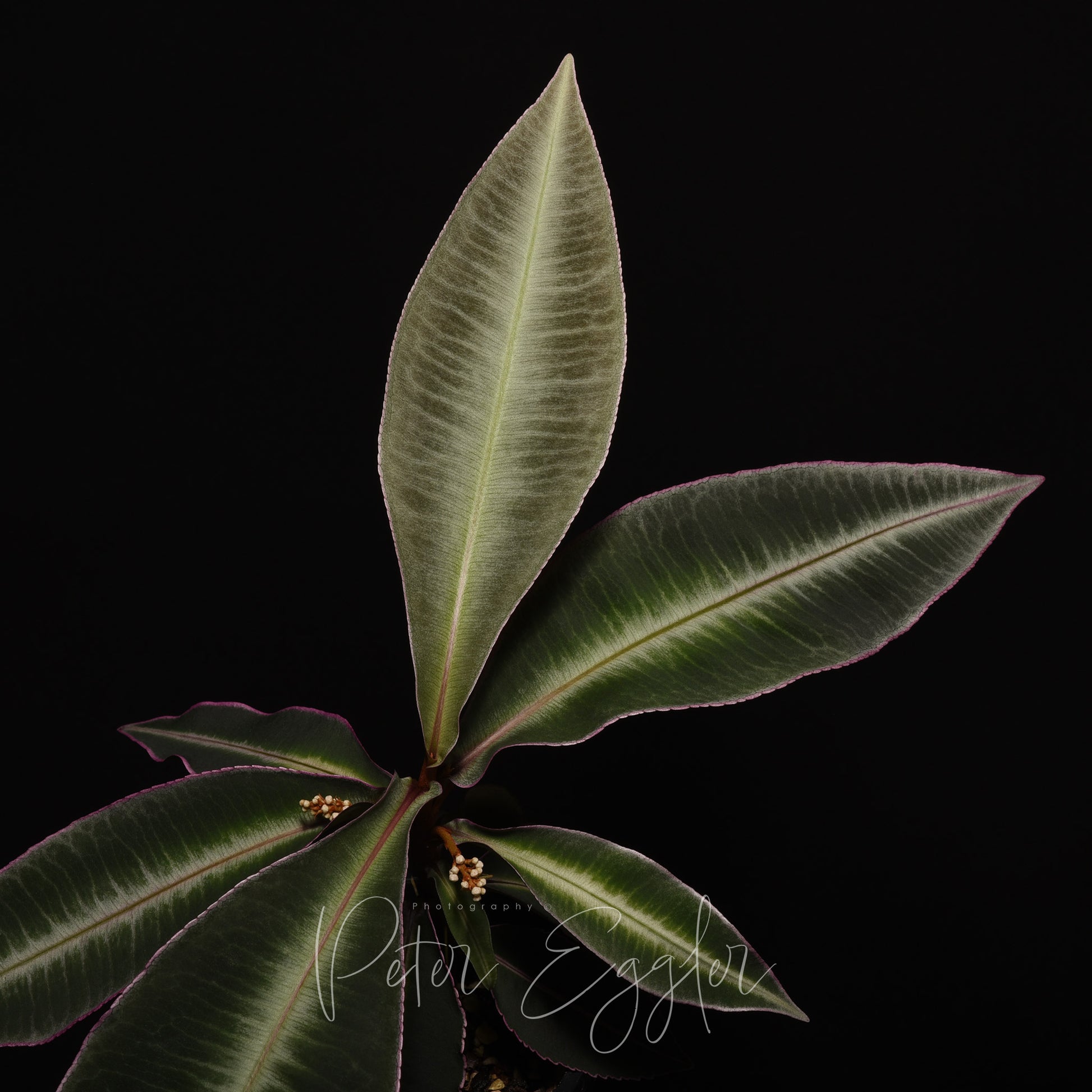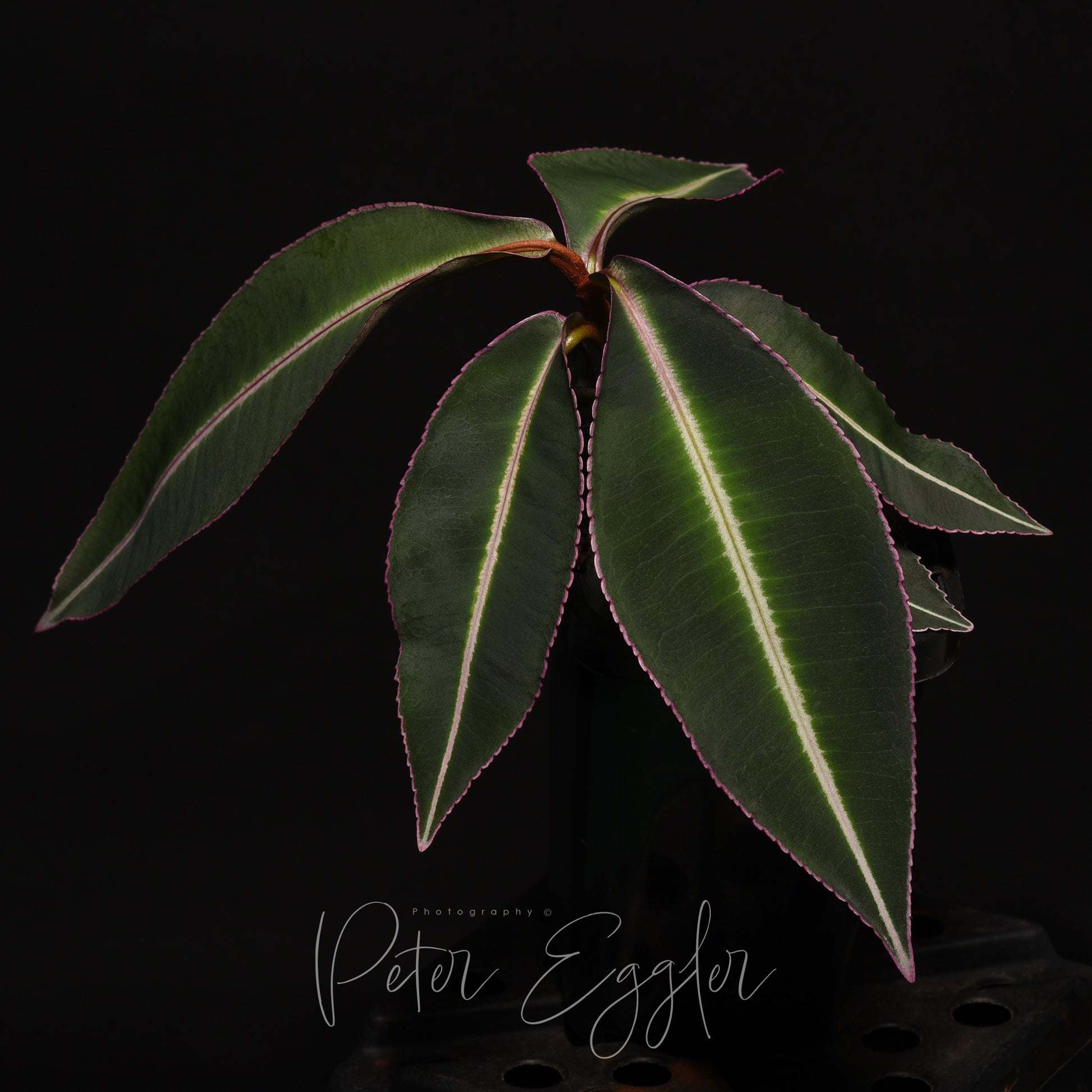 General Information and Cultivation3: A low growing, moisture-loving plant of the forest floor. The leaves of an immature plant are dark green with distinct light toned mid-vein and electric-pink serrated margin. In time the plant matures, producing large leathery leaves (to 250mm in length) in which the light tone of the mid-vein extends over the whole leaf (and the pink of the margin fades). Growth habit is reasonably compact, with mature terrarium grown specimens reaching 160mm in height. Easy to cultivate. Labisia pumila prefers humid terrarium conditions with a small amount of ventilation. Tankquility cultures this clone at about 23° Celsius (higher temperatures are ok) in a granular substrate based on akadama and scoria. Fertilize moderately.