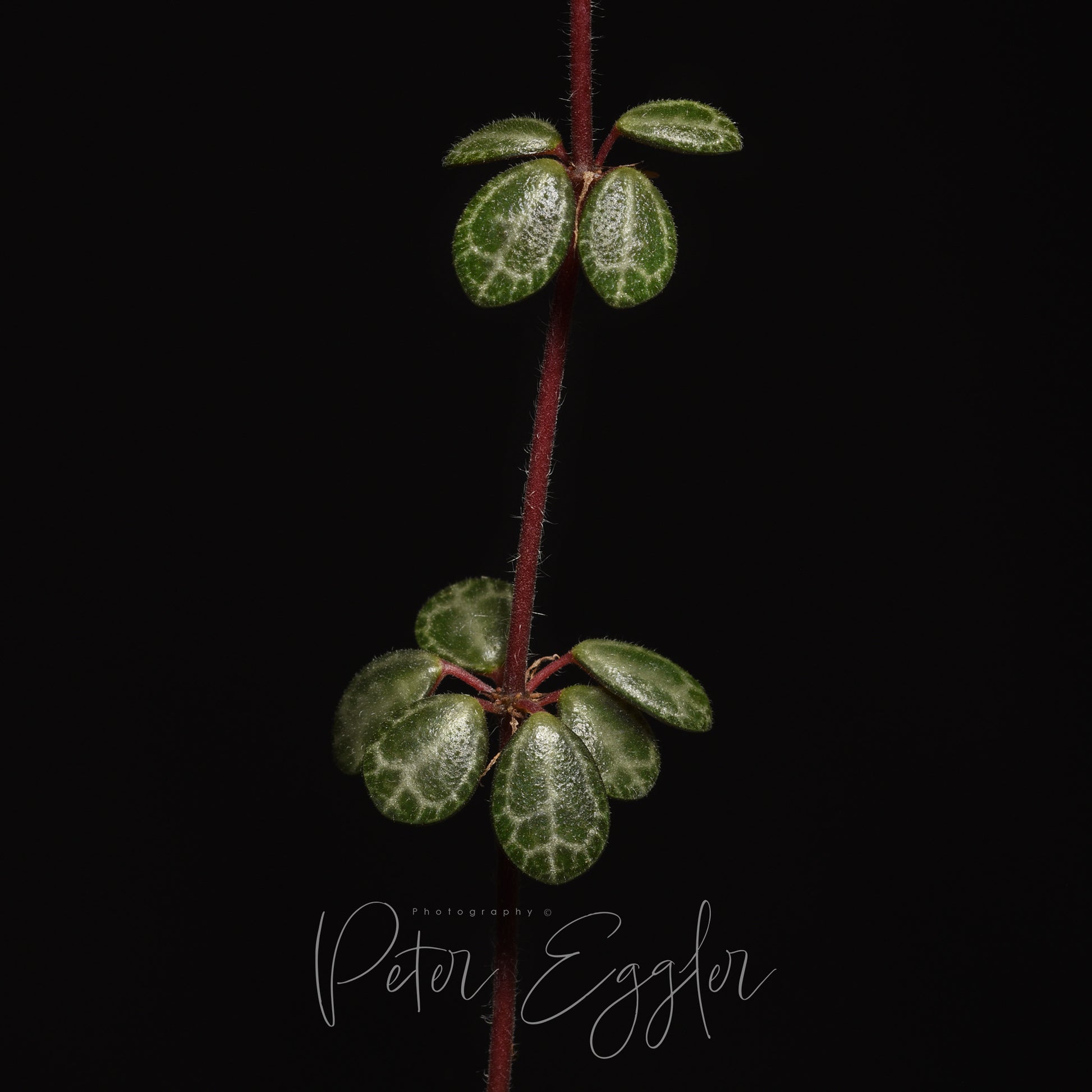 Image 2: Detailed view showing the fine hairs that cover both stem and leaves of Peperomia hunteriana, a characteristic that distinguishes it from Peperomia ×enervis