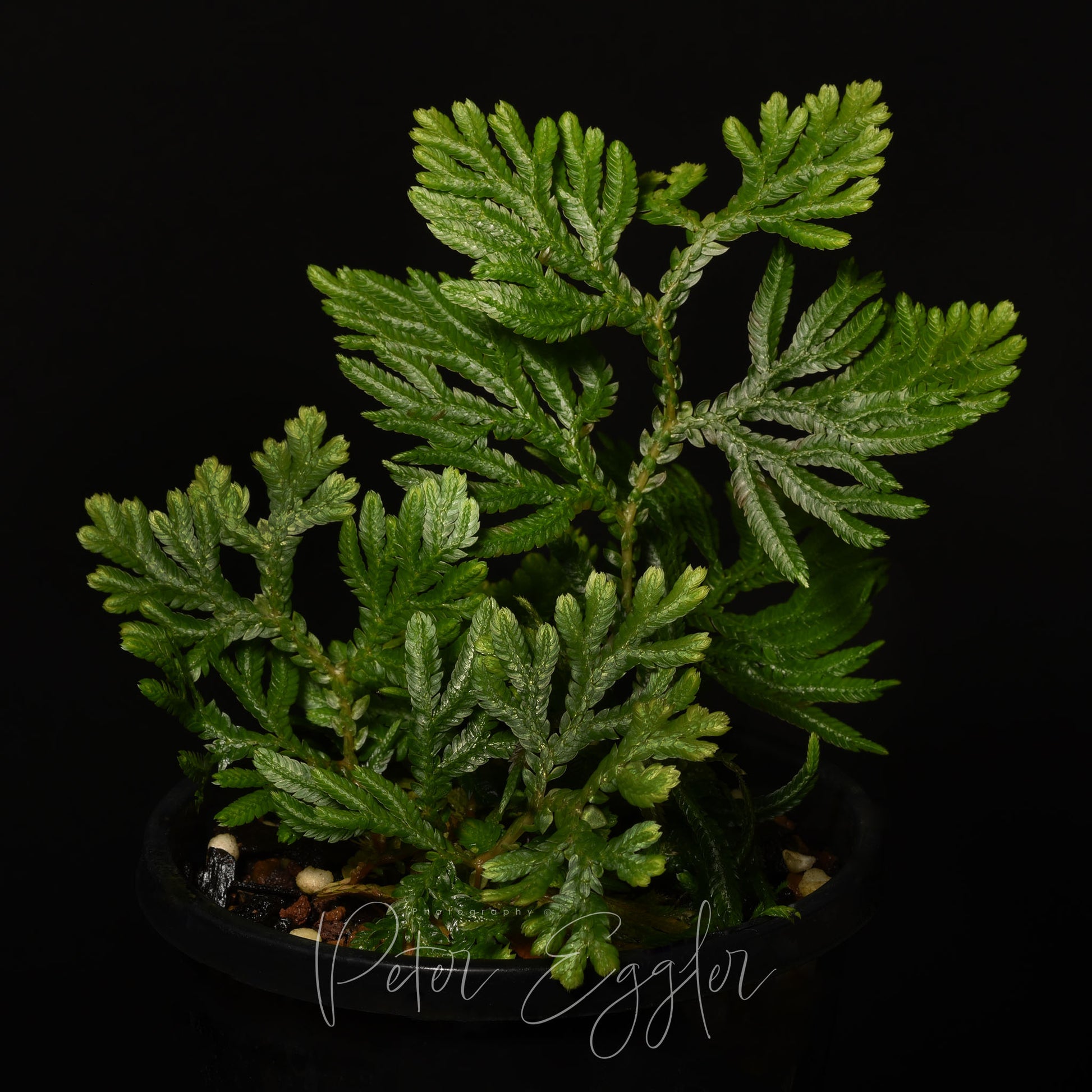 General Information and Cultivation3: When grown in a terrarium, Selaginella plana is a low growing carpeting plant. Under greenhouse conditions its growth habit becomes upright. Tankquility has found this species to be one of the easiest to grow and maintain Selaginella. A larger terrarium is preferred due to its spreading habit. Selaginella plana prefers humid terrarium conditions with reasonable ventilation. Tankquility cultures this clone at about 23° Celsius, in a granular substrate based on akadama and scoria. Fertilize sparingly.