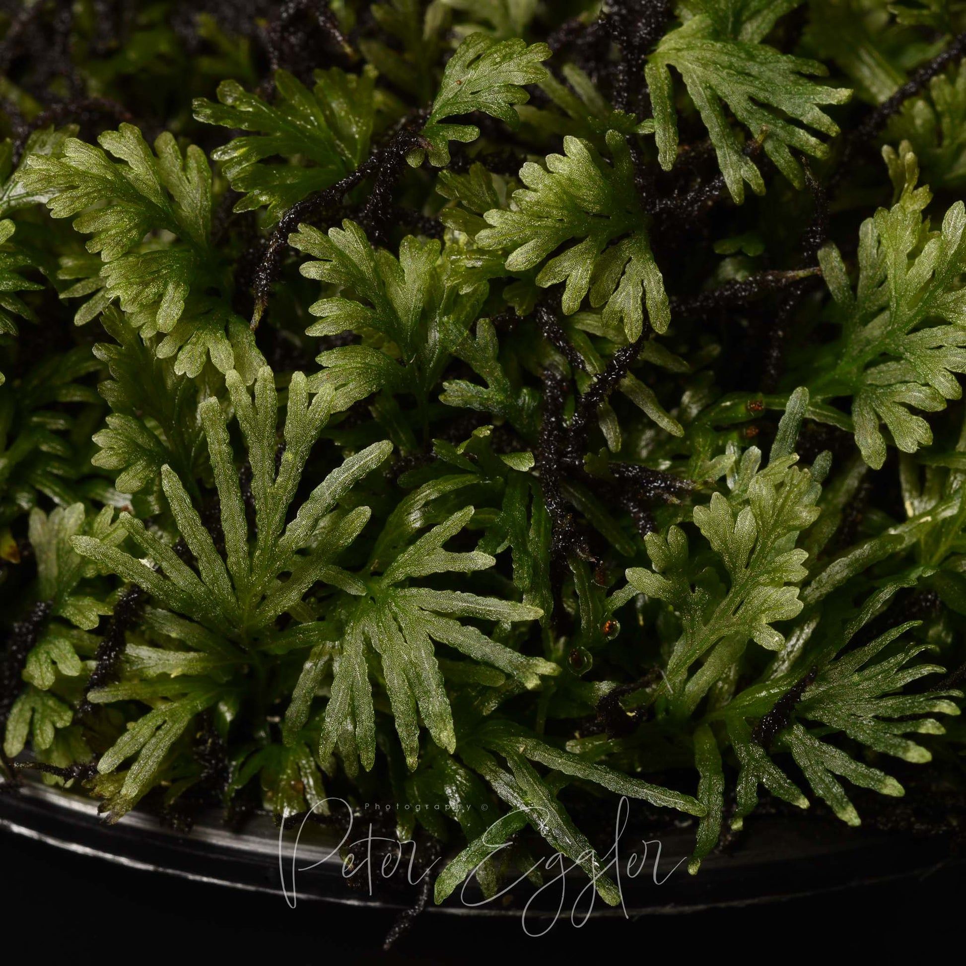 General Information and Cultivation3: A miniature, very slow growing prostrate epiphytic filmy fern, relatively easy to cultivate in both emerse and submerse conditions. Transitioning submerse grown plants to emerse culture is somewhat difficult and slow. Attach to wood and rocks in the aquarium or terrarium (to give a moss-like effect). Terrarium grown plants also do well in a free draining substrate that is kept reasonably wet. Do not bury the rhizome or it may rot. Culturing Trichomanes cf. malabaricum in a closed terrarium with frequent spraying of water (at least once per day) will help to keep the plant looking good.
